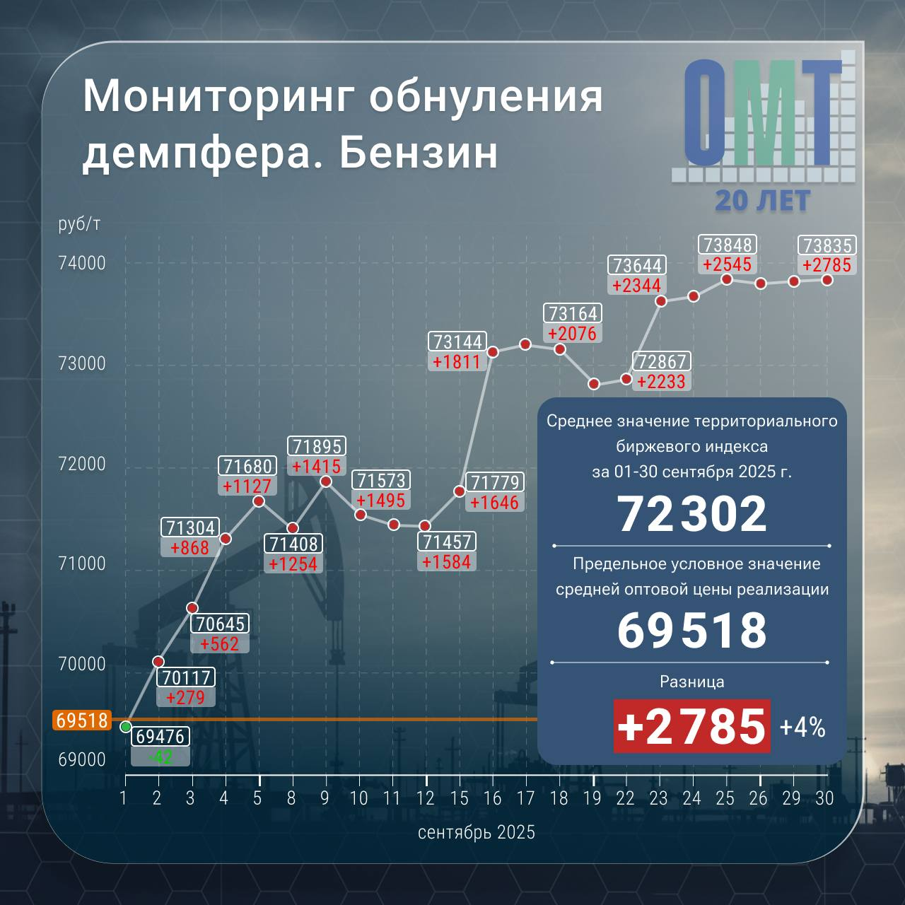 Бензин (АИ-92): демпфер не выплачивается, так как цены оказались на 4% (+2785 руб./т) выше предельных.