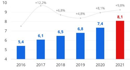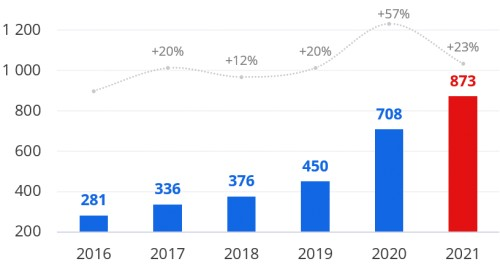 Однако, общий темп рост производства ПБВ значительно выше темпов роста производства битума. Так, за последние 5 лет производство ПБВ в РФ выросло более, чем в 3 раза. Это обусловлено как ростом спроса на высокотехнологичные материалы, так и востребованностью и перспективностью направления в будущем. Объем производства ПВБ в 2021 в РФ превысил 870 тыс. тонн. 11% доля ПБВ в общем объеме производства битума в РФ.