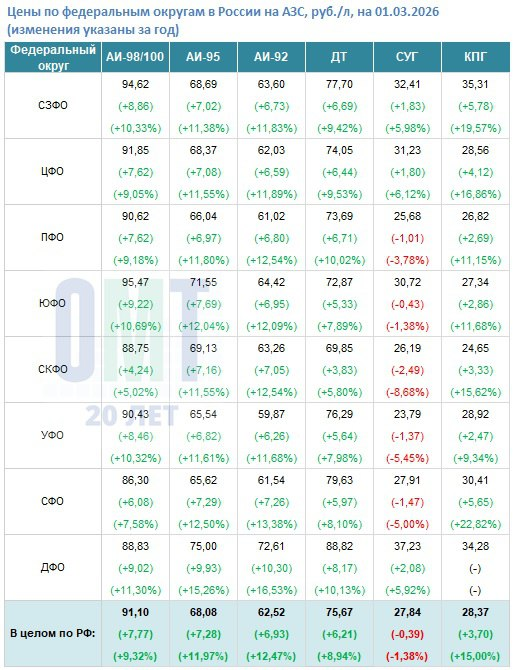 В период с 01.03.2025 по 01.03.2026 на АЗС России произошли следующие изменения: