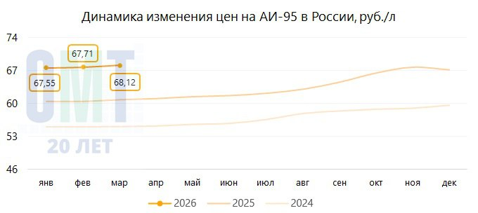 АИ-95 подорожал на +0,67% до 68,08 руб./л;