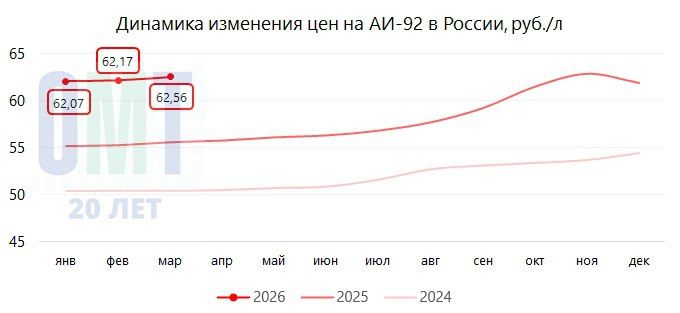 АИ-92 подорожал на +12,47% до 62,52 руб./л;