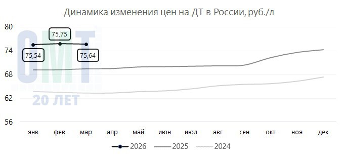 ДТ подорожало на +8,94% до 75,67 руб./л;