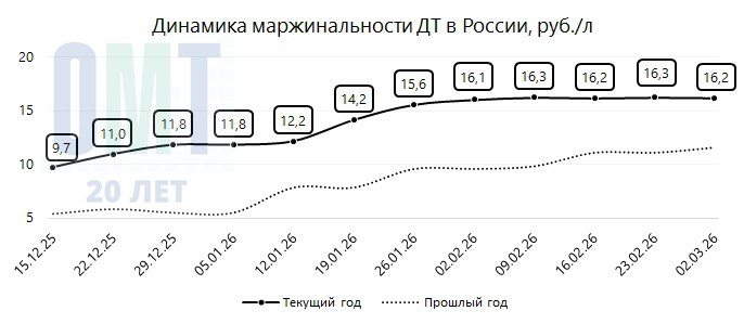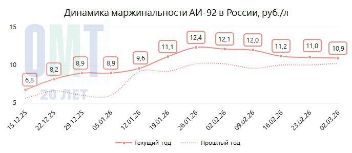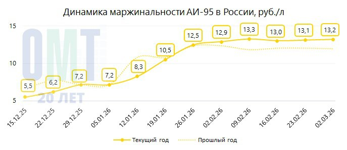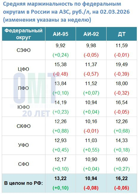 В период с 23.02.2026 по 02.03.2026 на АЗС в России средняя маржинальность на АИ-95 составила +13,22 руб./л; на АИ-92 +10,94 руб./л; на ДТ +16,22 руб./л;