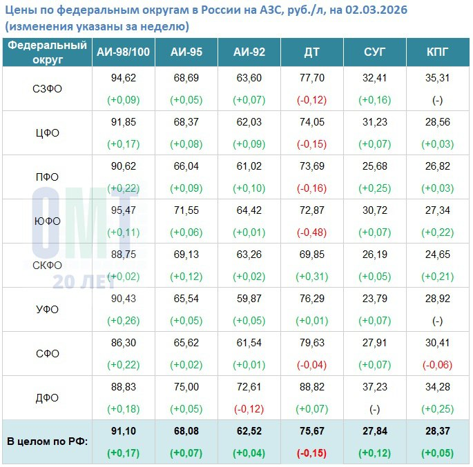 В период с 23.02.2026 по 02.03.2026 на АЗС по всей России произошли следующие изменения: