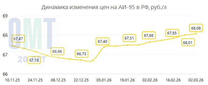 АИ-95 подорожал на +0,07 до 68,08 руб./л;