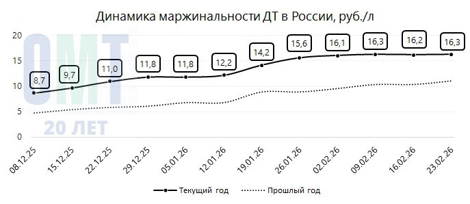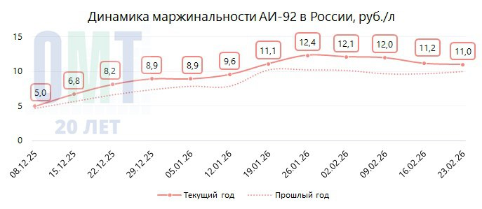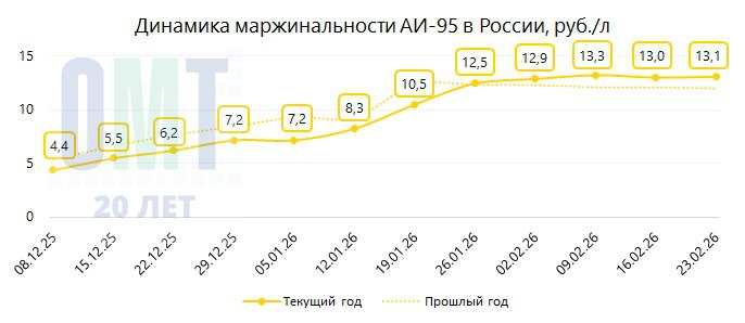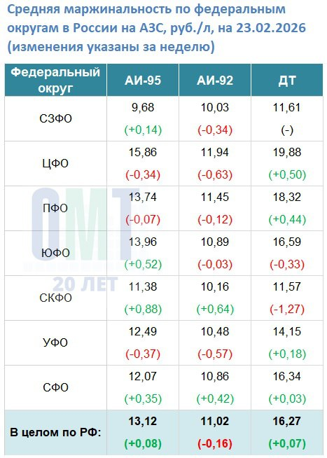 В период с 16.02.2026 по 23.02.2026 на АЗС в России средняя маржинальность на АИ-95 составила +13,12 руб./л; на АИ-92 +11,02 руб./л; на ДТ +16,27 руб./л;