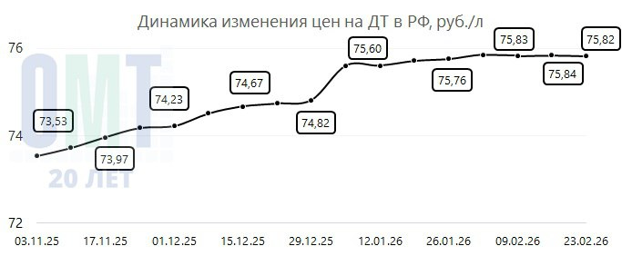 ДТ подешевело на -0,02 до 75,82 руб./л;